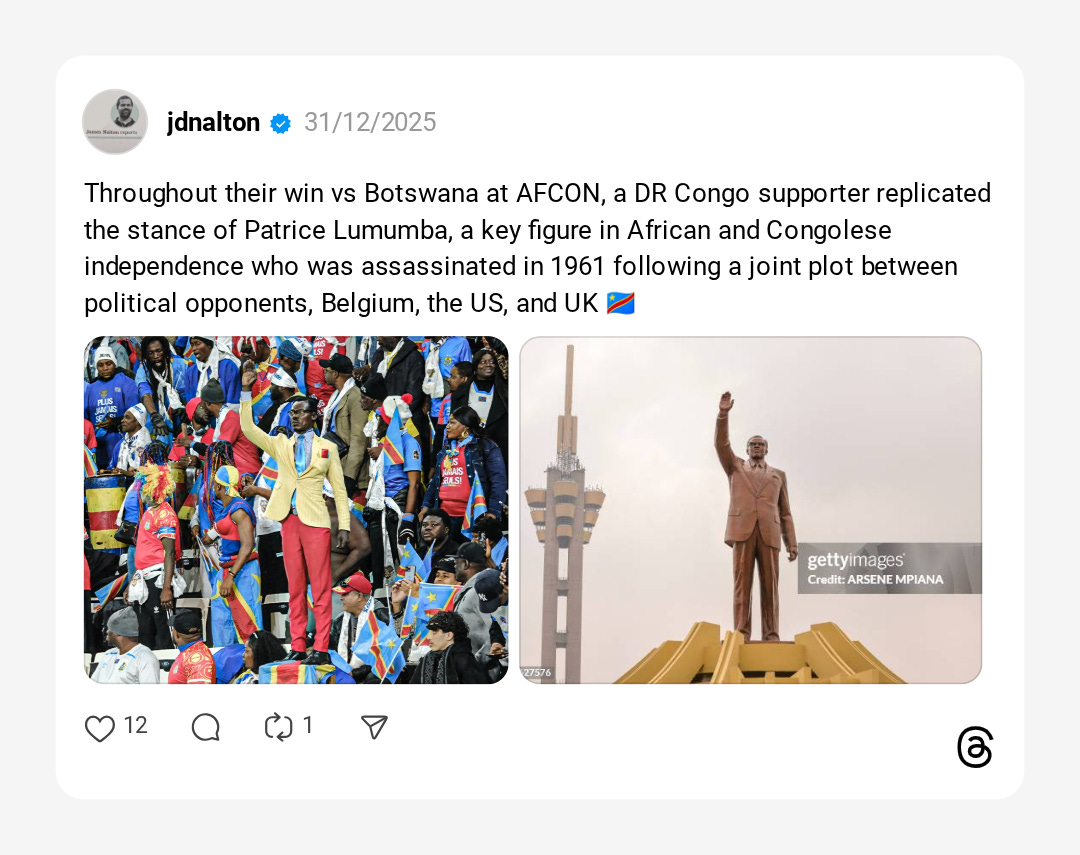 Throughout each of their games at AFCON 2025, DR Congo supporter Michel Kuka Mboladinga replicated the stance of Patrice Lumumba, a Congolese revolutionary who was a key figure in African and Congolese independence.